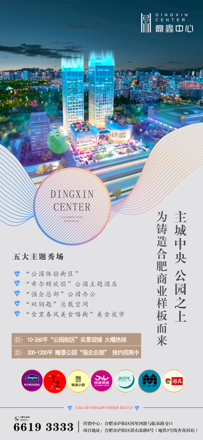 鼎鑫中心(備案名:鼎鑫金融中心),是鼎鑫集團(tuán)布局合肥,打造的首個(gè)公園主題特色商業(yè)項(xiàng)目,集公園主題街區(qū)、總部辦公、星級(jí)酒店、特色餐飲、美食夜市、娛樂(lè)教育等為一體的都市精品綜合體,也是合肥首個(gè)“夜市文化”的樣板示范街區(qū)。