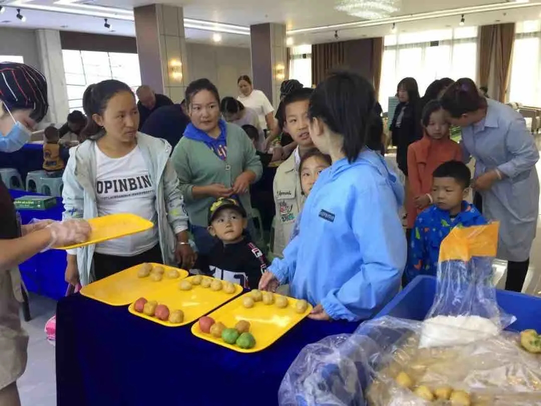 小朋友們排隊領(lǐng)取制作月餅的材料和模具