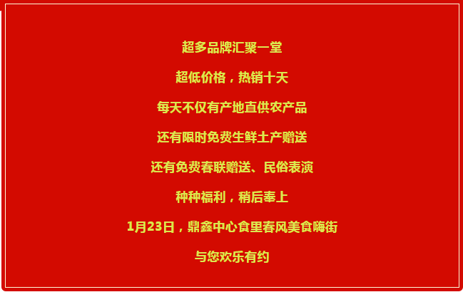 選對年貨,就相當于年過好了一半。鼎鑫中心食里春風美食嗨街為大家準備了豐厚的年貨,綠色健康的產(chǎn)地直供農(nóng)產(chǎn)品,是我們?yōu)橄M者送上的一份新春大禮包。