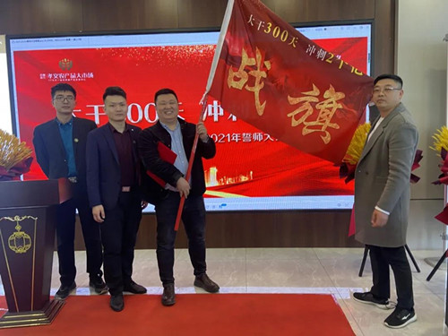 最后, 胡總授予魏總“目標(biāo)責(zé)任書”,孫總授予“戰(zhàn)旗”,在全體員工激情迸發(fā)之下,迎來了誓師環(huán)節(jié)。手持戰(zhàn)旗,鏗鏘誓言,敲響了出征的戰(zhàn)鼓。每個人都用斗志昂揚的士氣展示使命必達(dá)的決心。在同仁的見證下,營銷部案場精英、渠道精英,招商精英擔(dān)起了這份責(zé)任。