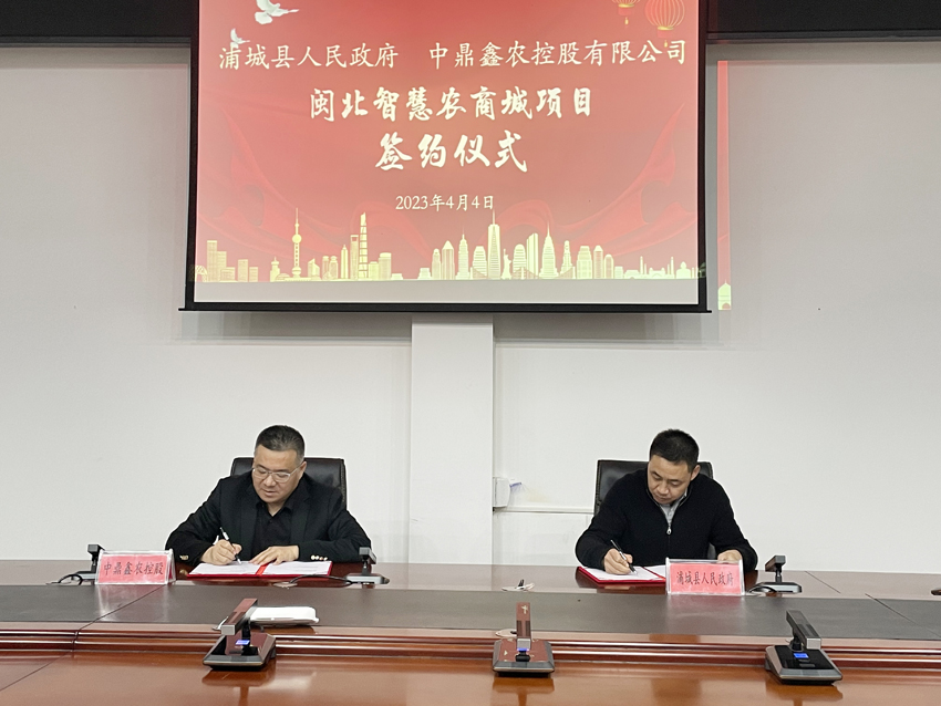 2023年4月4日,福建省浦城閩北智慧農(nóng)商城項目簽約儀式,在浦城縣政府隆重舉行, 浦城縣副縣長傅禮輝、商務局局長黃留斌、商務局劉嬌霞,中鼎鑫農(nóng)集團董事長鄭景利、投資發(fā)展中心總監(jiān)楊旭等企業(yè)高管共同參加了本次簽約儀式。