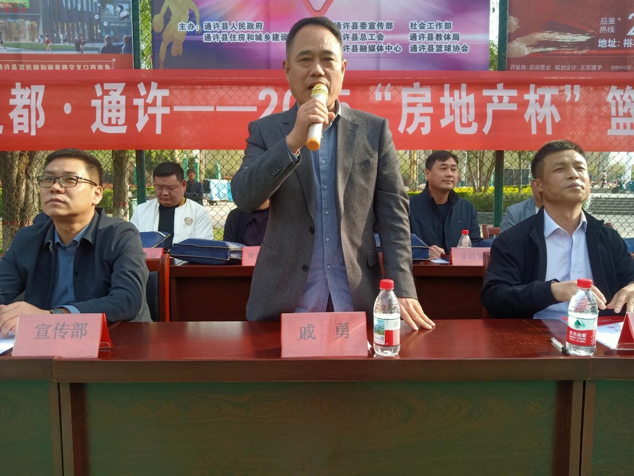 開封市住房和城鄉(xiāng)建設局黨組成員、副局長戚勇宣布通許縣首屆中國酸辣粉之都·通許—2025 “房地產(chǎn)杯”籃球賽開幕。