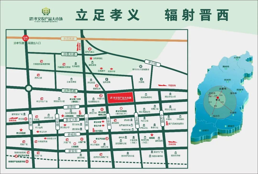 孝義農(nóng)產(chǎn)品大市場位于城市主干道永安路與崇賢街交匯處,項目總投資10億元,占地面積約220畝,總建筑面積約17萬㎡,涵蓋蔬菜、水果、糧油副食、干貨調(diào)料、海鮮水產(chǎn)、冷凍鮮肉、日雜百貨、酒店用品八大業(yè)態(tài);農(nóng)特優(yōu)展銷區(qū)、商務(wù)辦公區(qū)、倉儲 工區(qū)、冷鏈物流區(qū)、配套服務(wù)區(qū)六大功能區(qū)。項目建成后,將成為集農(nóng)產(chǎn)品展覽交易、電子商務(wù)、電子結(jié)算、加工配送、凈菜加工、冷鏈物流、質(zhì)量檢測、信息發(fā)布、創(chuàng)業(yè)孵化、金融服務(wù)、休閑娛樂等功能為一體的現(xiàn)代化大型農(nóng)批綜合服務(wù)平臺。