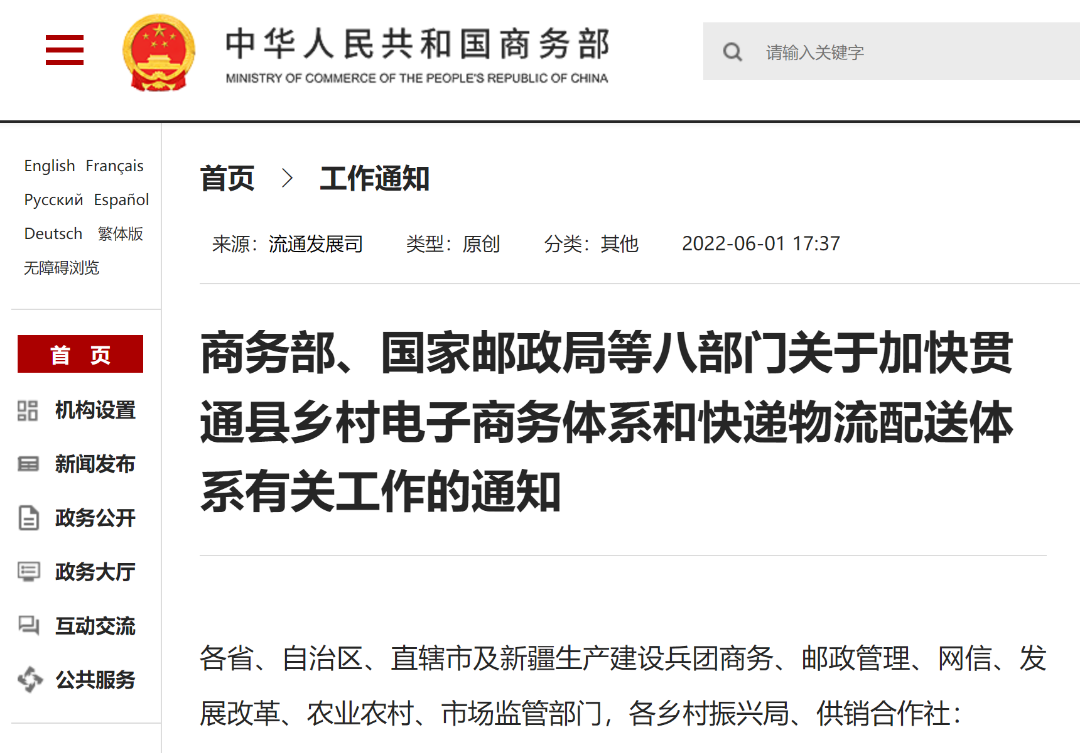 發(fā)展農(nóng)村電子商務(wù)和快遞物流配送是促進城鄉(xiāng)生產(chǎn)和消費有效銜接的重要舉措,是全面推進鄉(xiāng)村振興、構(gòu)建新發(fā)展格局的客觀要求。為認真貫徹落實黨中央、國務(wù)院決策部署,深入推進電子商務(wù)與快遞物流配送協(xié)同發(fā)展,加快貫通縣鄉(xiāng)村電子商務(wù)體系和快遞物流配送體系,現(xiàn)就有關(guān)工作通知如下。