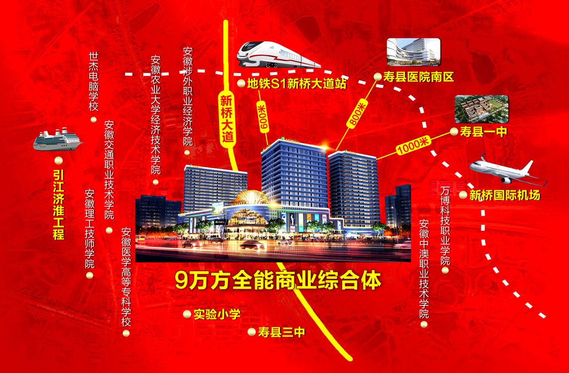 項(xiàng)目位于新橋大道與陽(yáng)光大道交匯處,傲居新橋最中心區(qū)域。項(xiàng)目?jī)A力打造新橋首席9萬(wàn)方全能綜合體,無(wú)縫融入合肥半小時(shí)都市圈,距離4E級(jí)合肥新橋國(guó)際機(jī)場(chǎng)8公里,合肥-新橋機(jī)場(chǎng)-六安城際高鐵、合肥地鐵S1號(hào)線(2025年通車)均于新橋產(chǎn)業(yè)園設(shè)經(jīng)停站(地鐵站距離本項(xiàng)目約800米),江淮運(yùn)河穿境而過(guò),兩千噸級(jí)新橋貨運(yùn)港區(qū)近在咫尺。周邊學(xué)區(qū)(壽縣一中、實(shí)驗(yàn)小學(xué))林立,八所大學(xué)城環(huán)繞,壽縣醫(yī)院也定址項(xiàng)目北約1公里。齊全的配套環(huán)境帶來(lái)無(wú)限的人氣和發(fā)展機(jī)遇。
