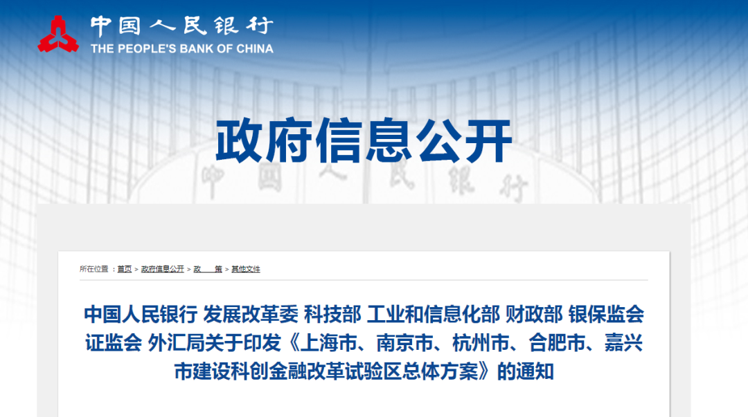 為深入貫徹習(xí)近平總書(shū)記關(guān)于長(zhǎng)三角一體化發(fā)展和創(chuàng)新體系建設(shè)的重要指示和講話精神,認(rèn)真落實(shí)黨中央、國(guó)務(wù)院決策部署,按照《長(zhǎng)江三角洲區(qū)域一體化發(fā)展規(guī)劃綱要》和《國(guó)家創(chuàng)新驅(qū)動(dòng)發(fā)展戰(zhàn)略綱要》要求,經(jīng)國(guó)務(wù)院同意,2022年11月18日,人民銀行、發(fā)展改革委、科技部、工業(yè)和信息化部、財(cái)政部、銀保監(jiān)會(huì)、證監(jiān)會(huì)、外匯局印發(fā)《上海市、南京市、杭州市、合肥市、嘉興市建設(shè)科創(chuàng)金融改革試驗(yàn)區(qū)總體方案》